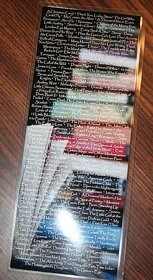 I’m not sure if you click on the image whether or not you can read all those words, but it’s all the books I’ve read this year (up through the Christmas Carol). Which was totally and completely amazing. I wish she’d tell me who she is, though, because I’d love to use the pictures on the bookmark (which I suspect she took herself) as a new blogskin…