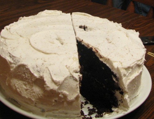 Actually, I looked at the wreck, tasted it a bit (it was pretty good) and — horror! — threw it in the trash. (M came home and was SHOCKED that I'd do such a thing…) The second cake was good, though.