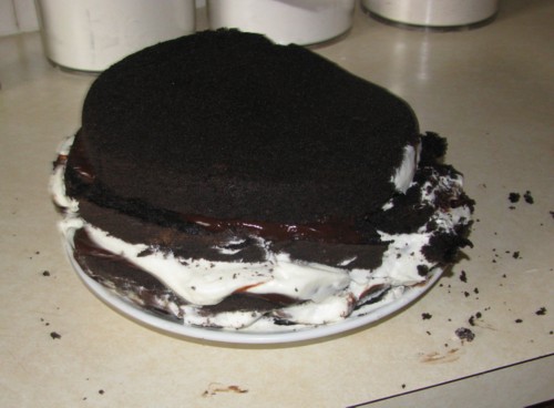 The cake wasn’t strong enough to hold the weight of whatever it was I was supposed to do… and so it all kind of fell apart. Thankfully, there was time for Plan B — which was a box cake (shameful!) and some leftover white chocolate/peppermint whipped cream filling. That, at least, turned out.