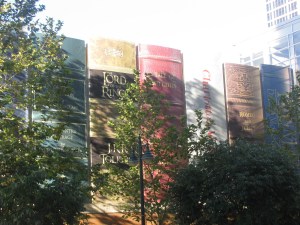 I don’t know if you can tell (not the world’s best photograph), but that’s — from what we can figure — a parking garage with murals of books on the side. The steps are books, too. We were in awe. The books ranged with their titles, too: there’s poetry by Langston Hughes, The Tao de Ching, Romeo and Juliet, The Tale of Two Cities and, just when I was beginning to despair of any kids books: