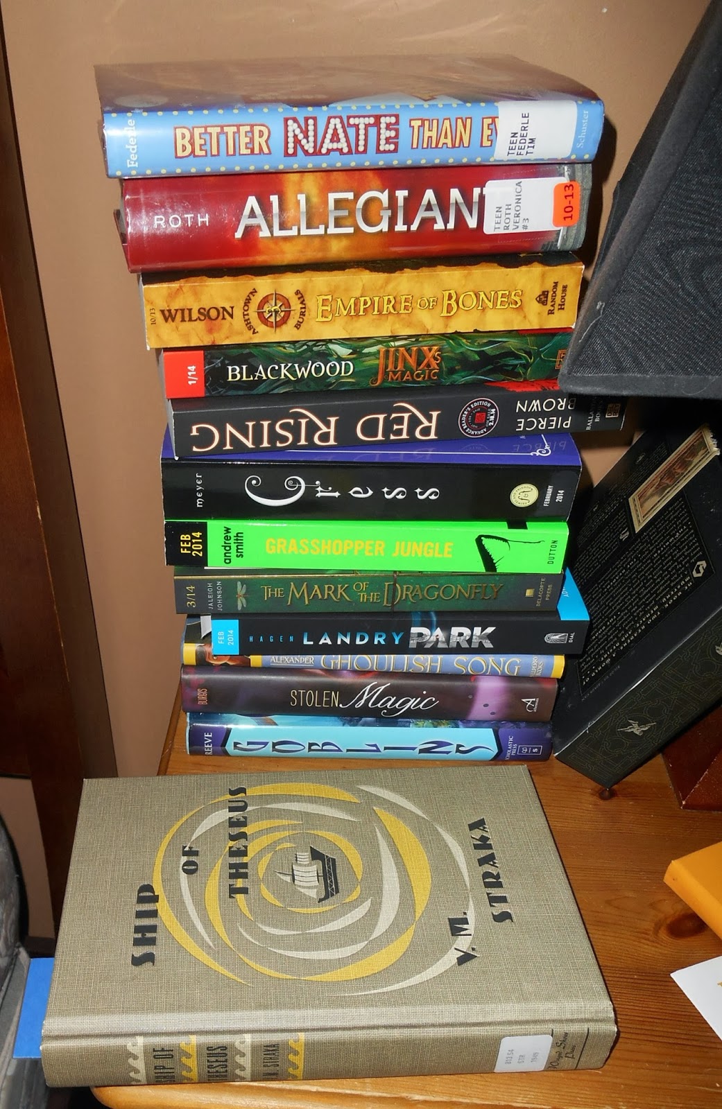 After Cybils have ended — especially when one is on the round one panel — there is, at least for me, a little bit of burn-out. I just want to stop reading all together for a while. Maybe watch a dozen movies or so. (Actually, only three: Skyfall, Frozen, and Saving Mr. Banks.) But, eventually, the inevitable happens, and books start piling up on my nightstand again. And I’ve caught a cold, so that means my energy level is set at “lay around and read”. Maybe I can knock a few of these off this weekend. (It won’t happen, but it’s nice to think that, anyway.) There are also a ton of ARCs on this pile because my one goal this year is to keep up with what I take from the shelves at work. That may not last, mostly because I’ve been thinking about the Casson family and have been wanting to re-read those books.
