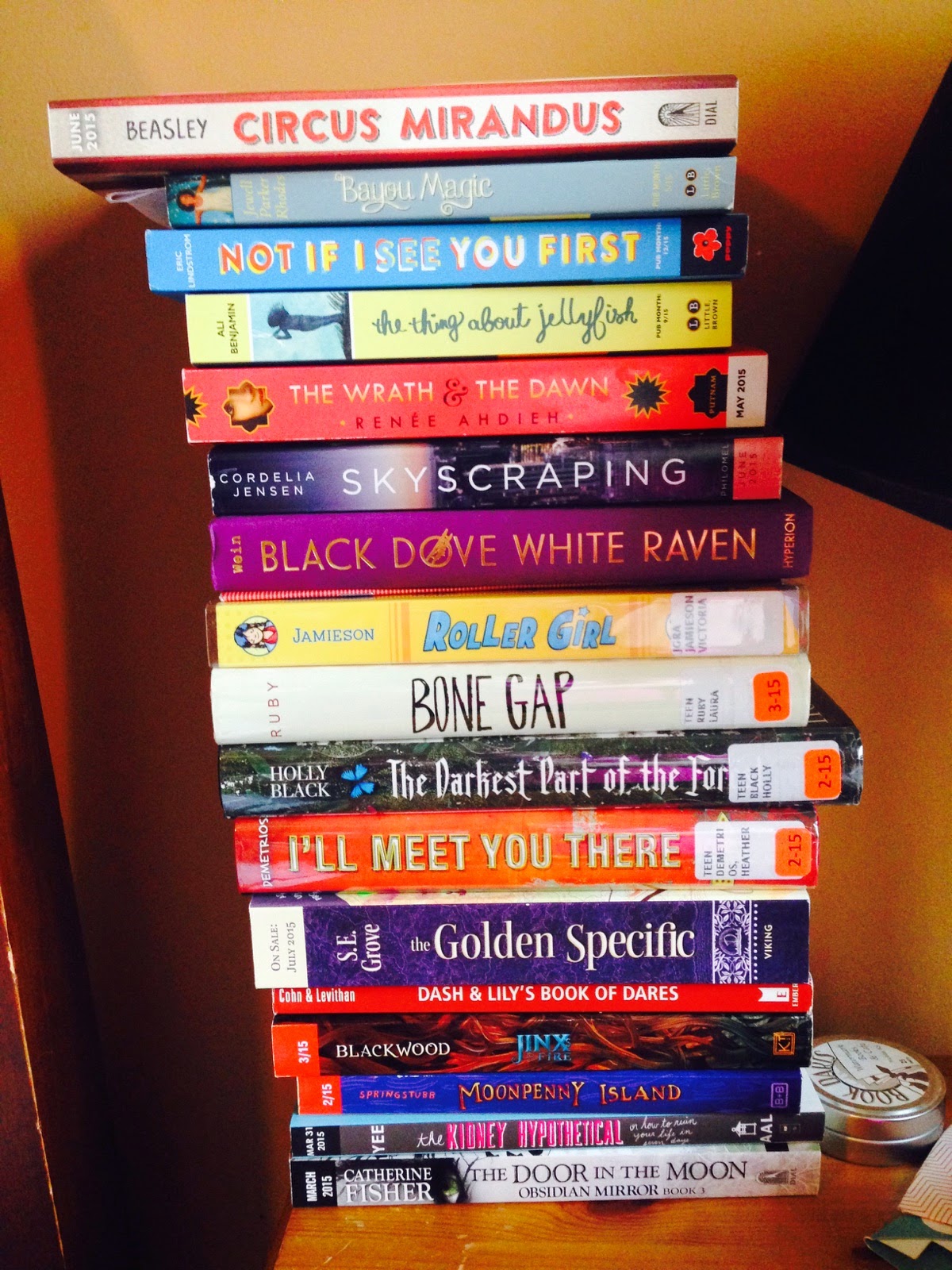 It’s truly out of control this month, but there is a good reason. Well, one good reason: I’ve added books that I need to have read before the ABA Children’s institute next week in Pasadena. To which I’m going. (And very excited about. I’m also planning on making time to get to the beach. Which I am also very excited about.) And so, those take precedence. But I’ve also grabbed a few at the library which I need/want to read and that’s pushing the backlist ones further down. Thankfully, I’ve got plane flights coming up (I love reading on plane flights; I get so much of it done), and I’m hoping I can knock out a bunch of these.