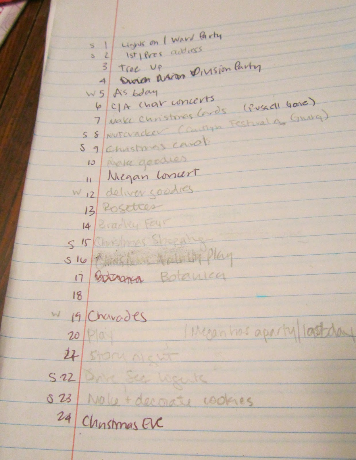 Some of the events are permanent (like A’s birthday is ALWAYS on the 5th), some events we have to work around (like choir or band concerts), and some events can be moved around (like charades or story night). But generally, sometime around Thanksgiving, Hubby and I sit down and work out what has to be done and what we want to be done, tradition-wise, for this year’s Christmas season.