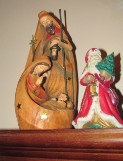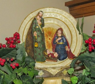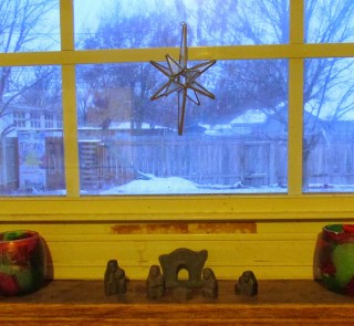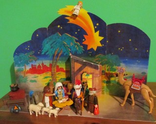 This one, out of all of the displays, gets the most use. The girls, when they were younger, loved playing with it, rearranging the pieces, switching the hair on the wise men and shepherds. It’s gotten used for church, and sometimes I’m surprised the backdrop is still standing, or that the angel still has her wings (she lost her halo years ago, though.)